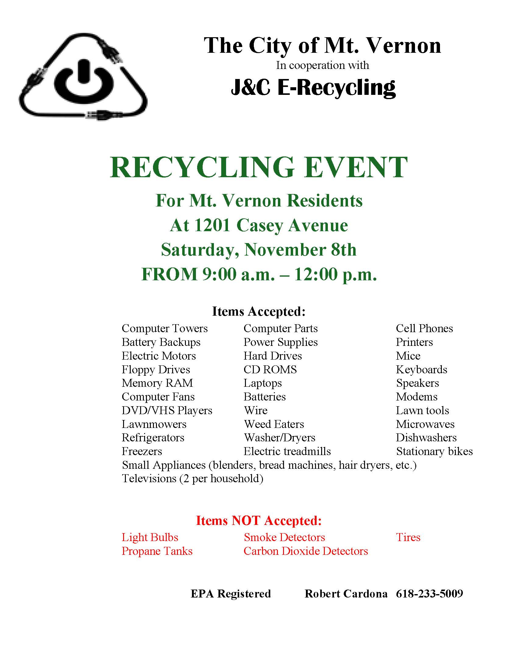 The City of Mt. Vernon, in cooperation with J&C E-Recycling, will host a Recycling Event on Saturday, November 8 at 1201 Casey Avenue from 9 AM – 12 PM.