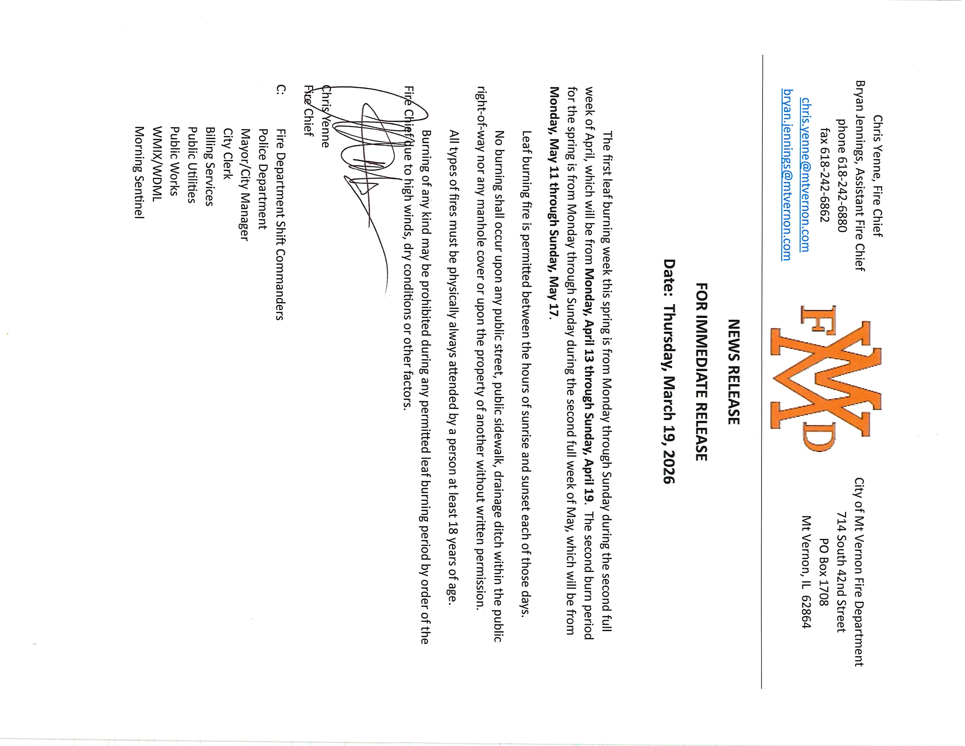 - Burning may be stopped at any time if conditions are dry, windy, or unsafe (decision made by the Fire Chief).